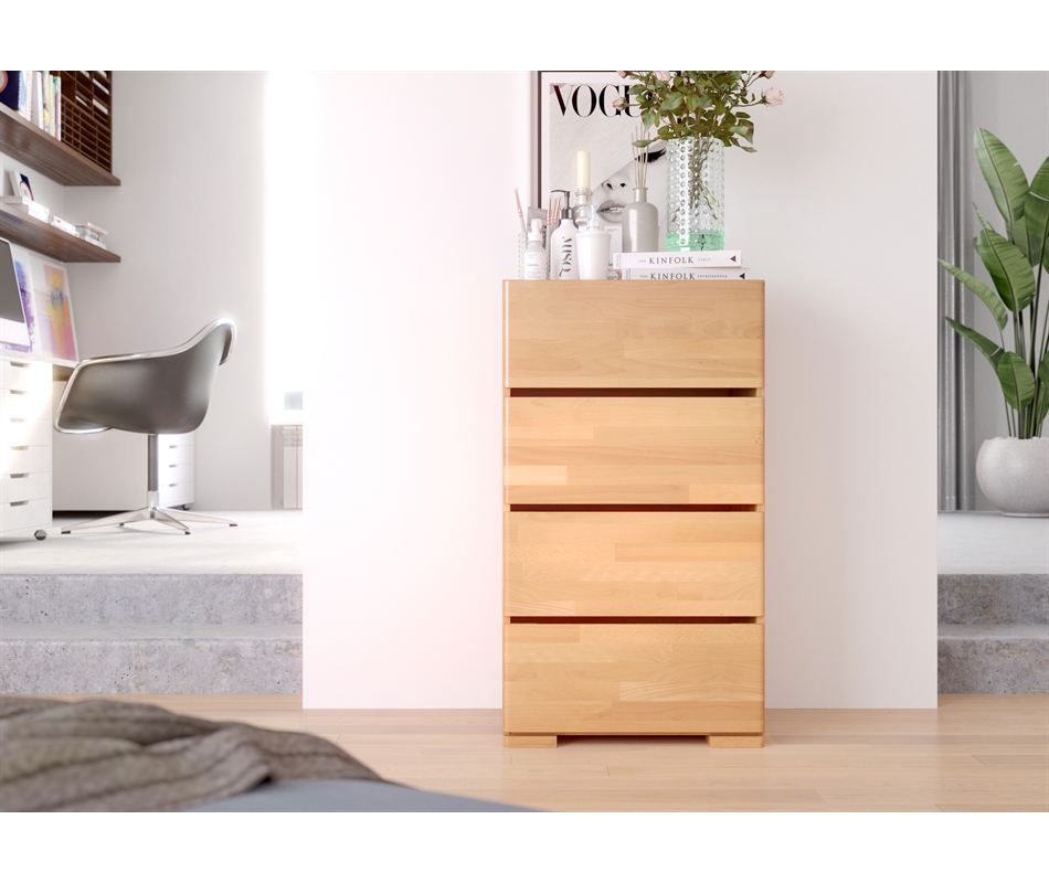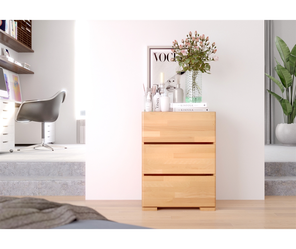 Cassettiera in lamellare di faggio massiccio disponibile nella versione con tre o quattro cassetti. Altezza 108/81 cm, larghezza 60 cm, profondità 45 cm.