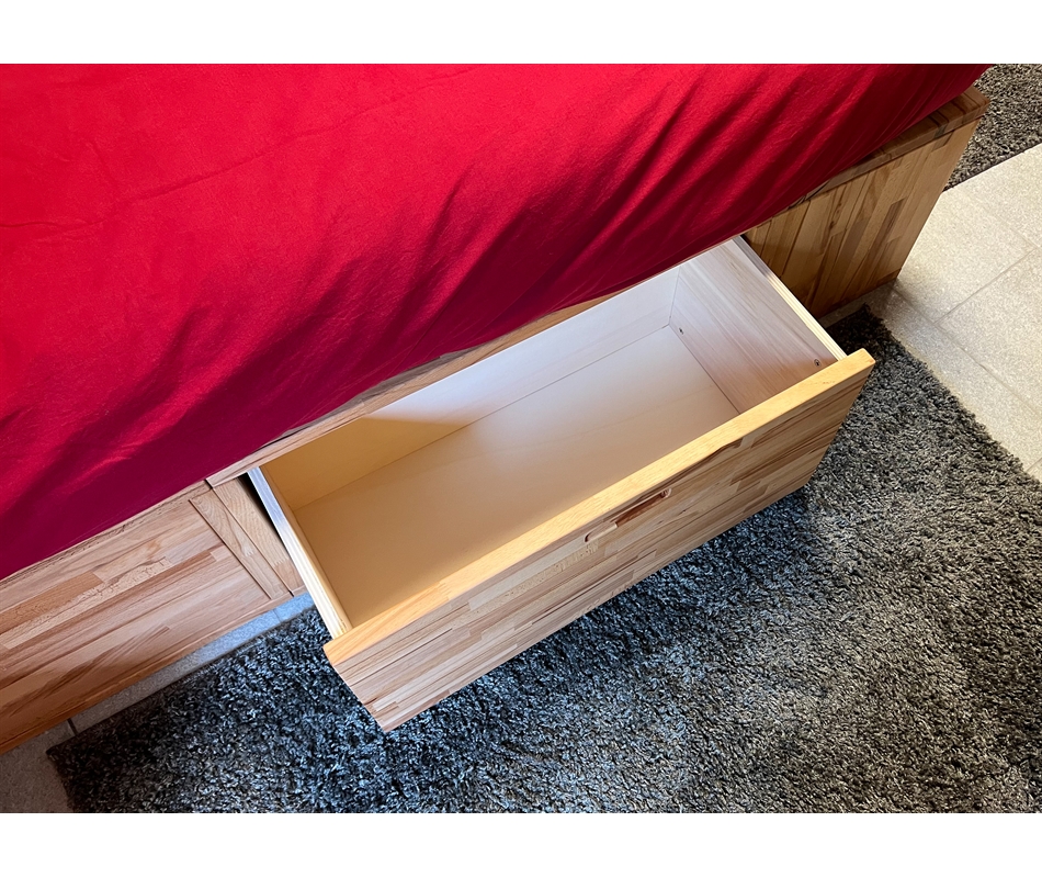 Divano Letto con cassetti in lamellare di faggio. Prodotto artigianale modulare. Nella disposizione in foto, sono pienamente utilizzabili 3 cassettoni 80x40 cm ed un vano giorno da 40x40 cm. Nella struttura sono presenti altri tre pezzi senza cassetto (uno da 40x40 cm e due da 80x40 cm) che non sono raggiungibili quando il divano è sistemato ad angolo contro il muro. Il cassettone laterale utilizzato come comodino, si può opzionalmente rimuovere. Il letto è progettato per un materasso da 80x200...