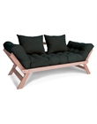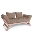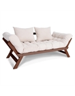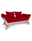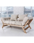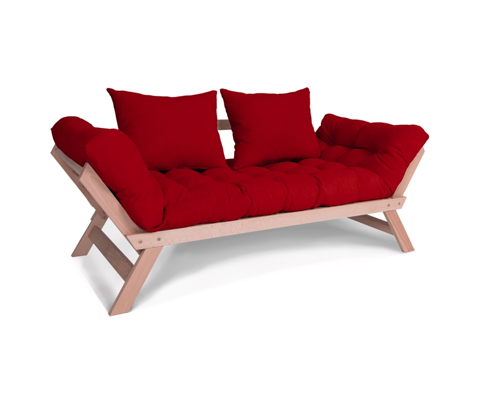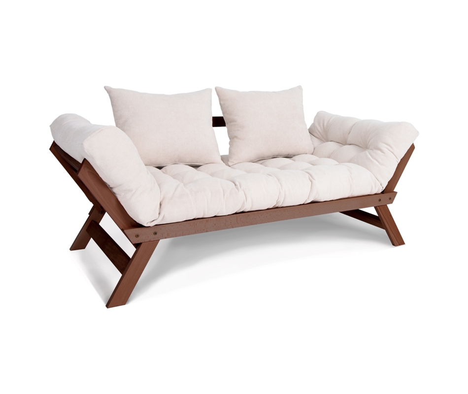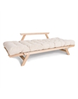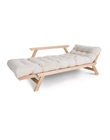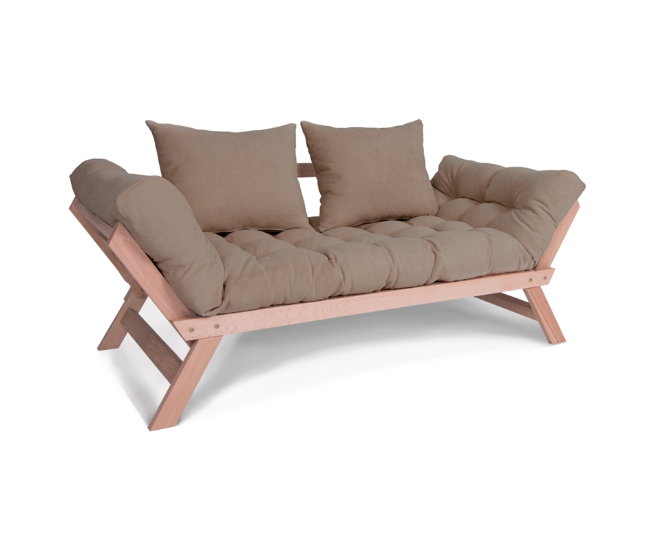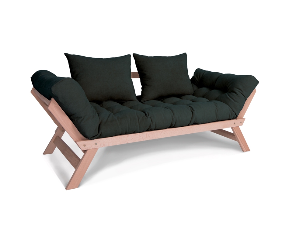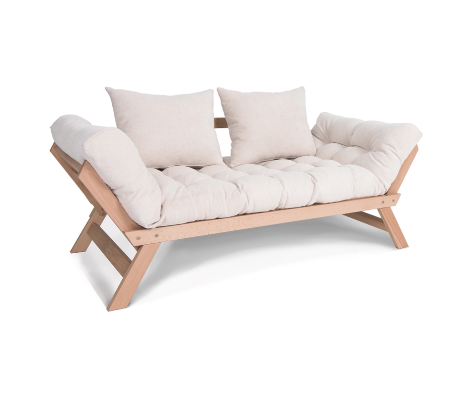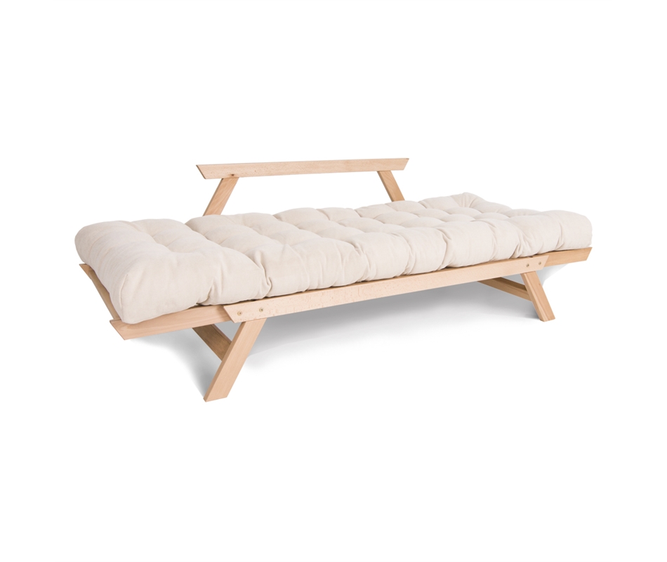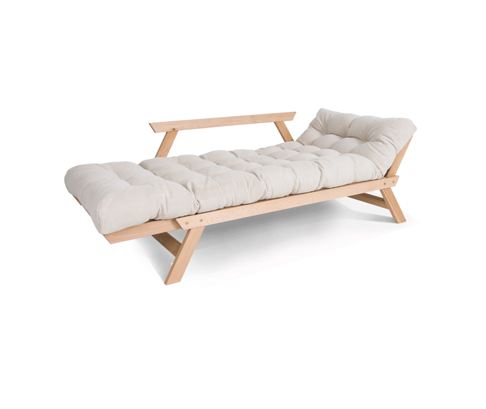 Il divano letto Nova in legno di faggio può trasformarsi, grazie ai braccioli laterali obliqui, in letto singolo o chaise longue.