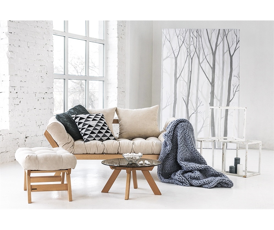Il divano letto viene fornito di serie nelle colorazione naturale o noce, realizzate con olio di lino, oppure non trattato.