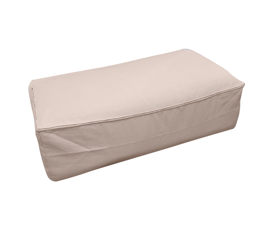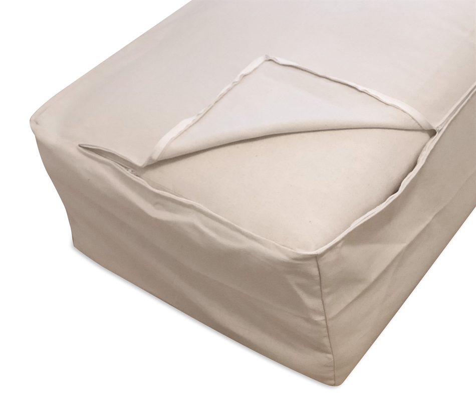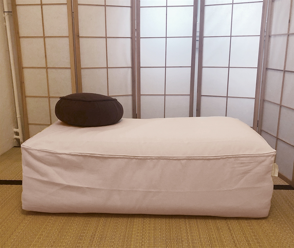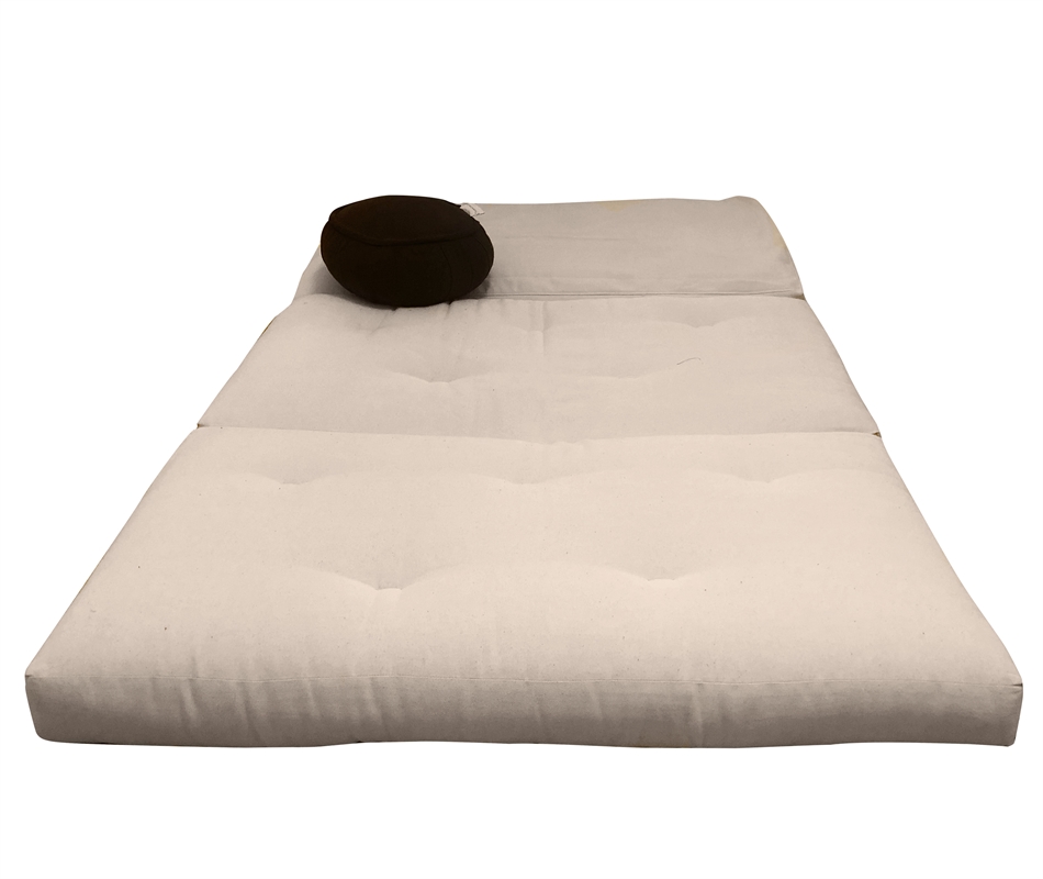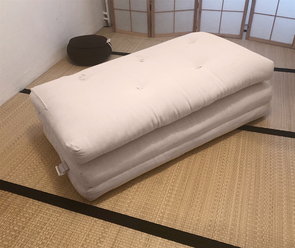 Futon ripiegato a forma di pouff. Tessuto greggio, imbottitura 4 strati 100% cotone.