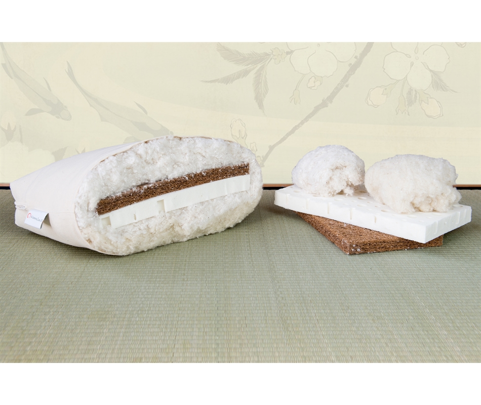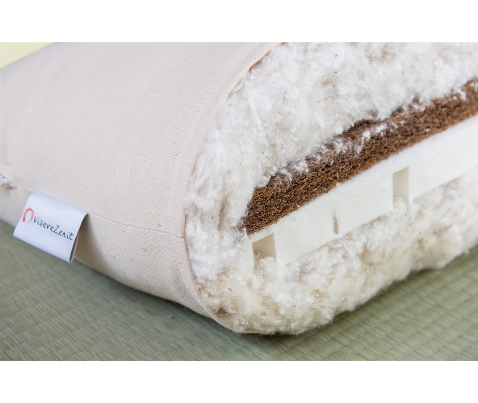 Futon in cotone 100% naturale con inserti in lattice, cocco e falda lana aggiuntiva. Formato da 1 str. di lana, 1 str. di cotone, 1 str. di lattice, 1 str. di cocco, 1 str. di cotone. Altezza 15 cm. Rivestimento in cotone 100% colore naturale. Cerniera d'ispezione. Indicato per l'uso come materasso a sostegno rigido ed indeformabile. La foto del prodotto è una sezione del futon.