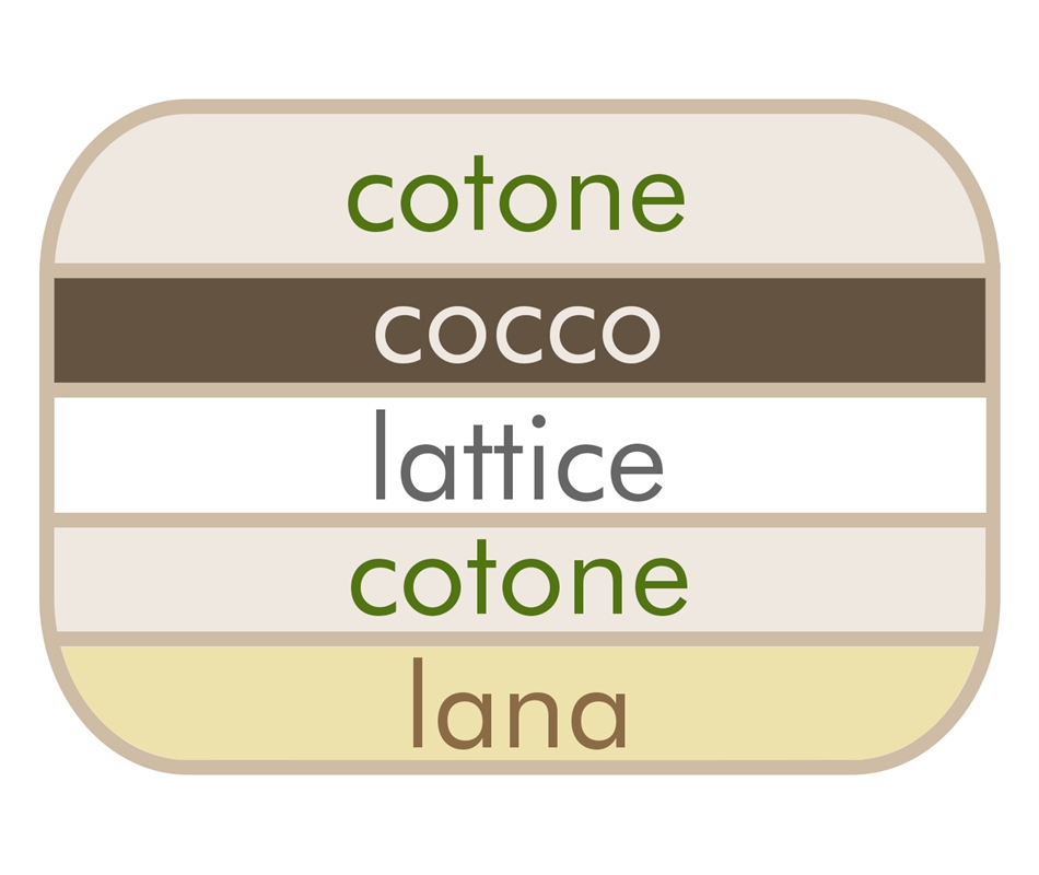 Formato da 1 str. di lana, 1 str. di cotone, 1 str. di lattice, 1 str. di cocco, 1 str. di cotone. Altezza 15 cm. Rivestimento in cotone 100% colore naturale. Cerniera d'ispezione. Indicato per l'uso come materasso a sostegno rigido ed indeformabile.