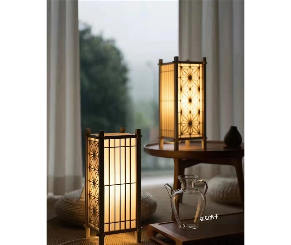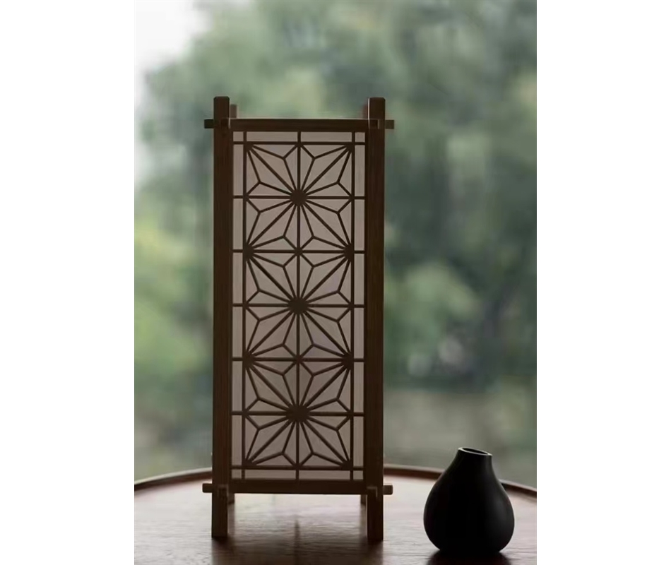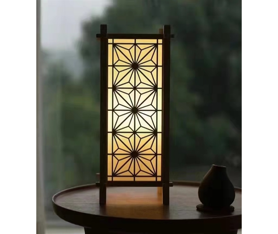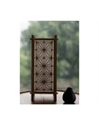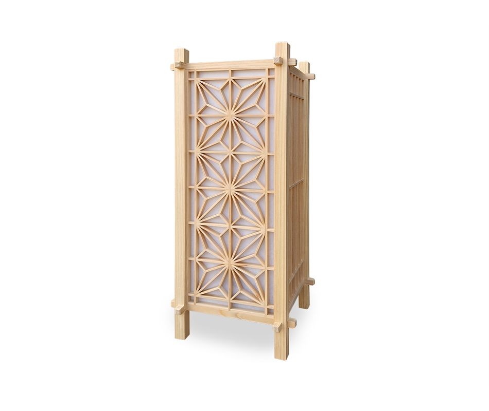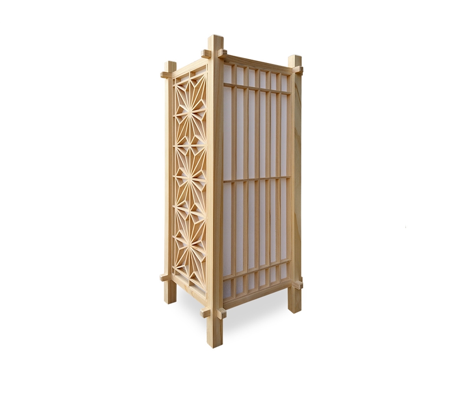 Lampada Giapponese artigianale realizzata in legno di Hinoki o cipresso giapponese con decoro floreale e carta di riso. Non sono utilizzate vernici, realizzata a mano. La lampada è completa di filo elettrico con interruttore e porta lampadina con attacco E27 (grande).