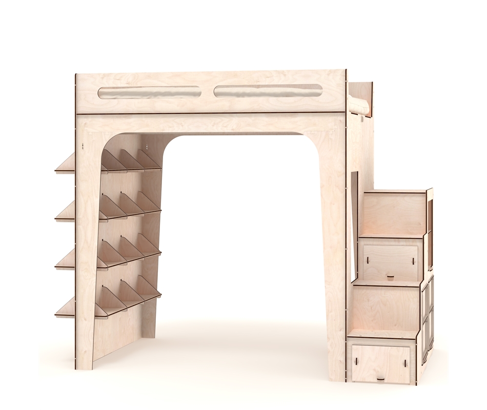Letto a soppalco in multistrato di betulla da 12 mm di spessore, composto da una serie di elementi che si assemblano per incastro, tutti i componenti sono tagliati con tecnologia laser, al fine di ottenere incastri esatti e rendere l'oggetto solido e stabile: si tratta infatti di un prodotto estremamente robusto, al letto viene incorporata una scala progettata per poter ospitare al suo interno ripiani per libri, vestiti o altri oggetti. Le reti del letto sono formate da 2 piani in multistrato tr...