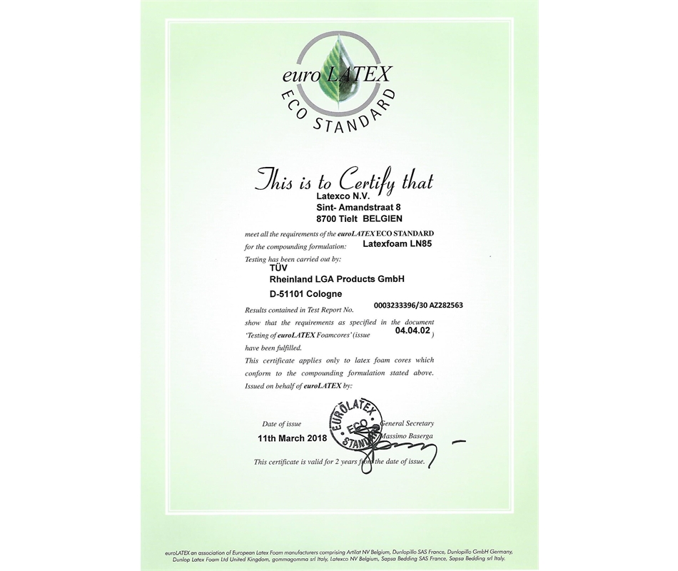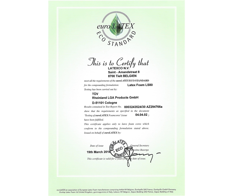 I materassi in lattice a marchio Latexco vantano di utilizzare esclusivamente lattice naturale derivato da piantagioni controllate e certificate ISO (ISO14001) che rispondono agli standard di qualità più rigorosi. I materassi in lattice della Latexco hanno le certificazioni ecologiche Öko-Tex Standard 100 e Eurolatex, la certificazione di qualità LGA, nonché il marchio comunitario di qualità ecologica, Ecolabel (2002/740/EU).