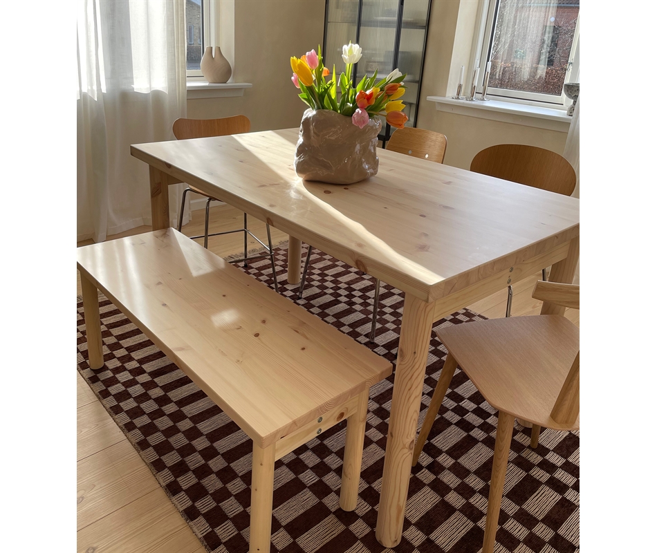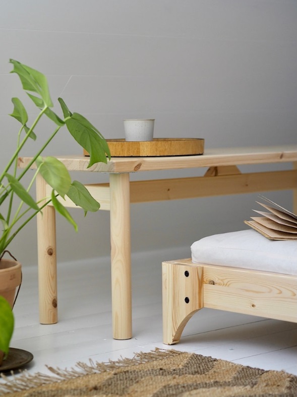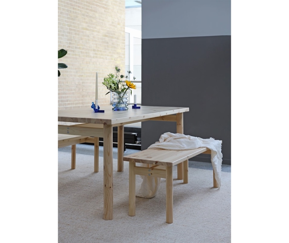 Le forme semplici e geometriche si combinano all'aspetto rustico e nodoso del legno di pino.