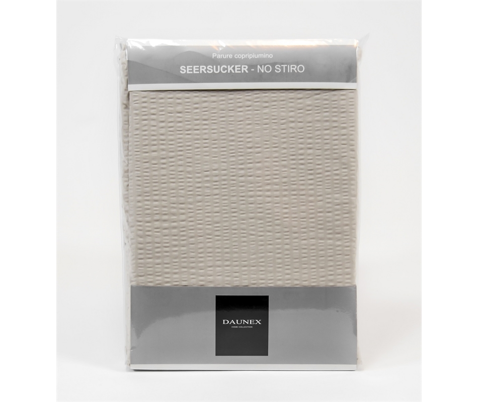 Copripiumino 250x200 + 40 cm patella. 2 Fodere 50x80 incluse. 100% Cotone no stiro. La lavorazione Seersucker (anche detta gaffrato in italiano) è un tipo di tessitura ad armatura tela, originaria dell'India. E'caratterizzata da un'alternanza di fili tesi, alternati ad altri più allentati, che creano il tipico aspetto rigato e stropicciato della stoffa. Questa tipologia di tessitura ha il vantaggio di non far rimanere il tessuto "appiccicato" alla pelle, facilitando la traspirazione, la dissip...