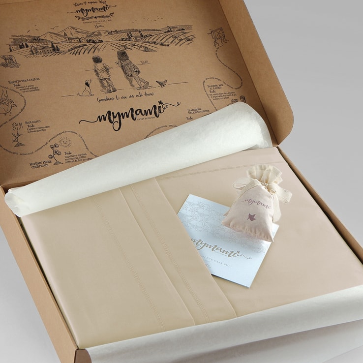 I completi letto Mymami vengono confezionati artigianalmente in percalle, tessuto confortevole e pregiato di medio peso, molto compatto, di mano liscia e realizzato con filati di cotone pettinato