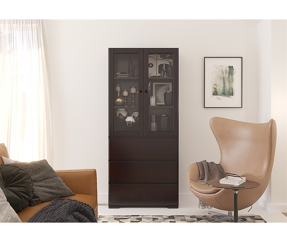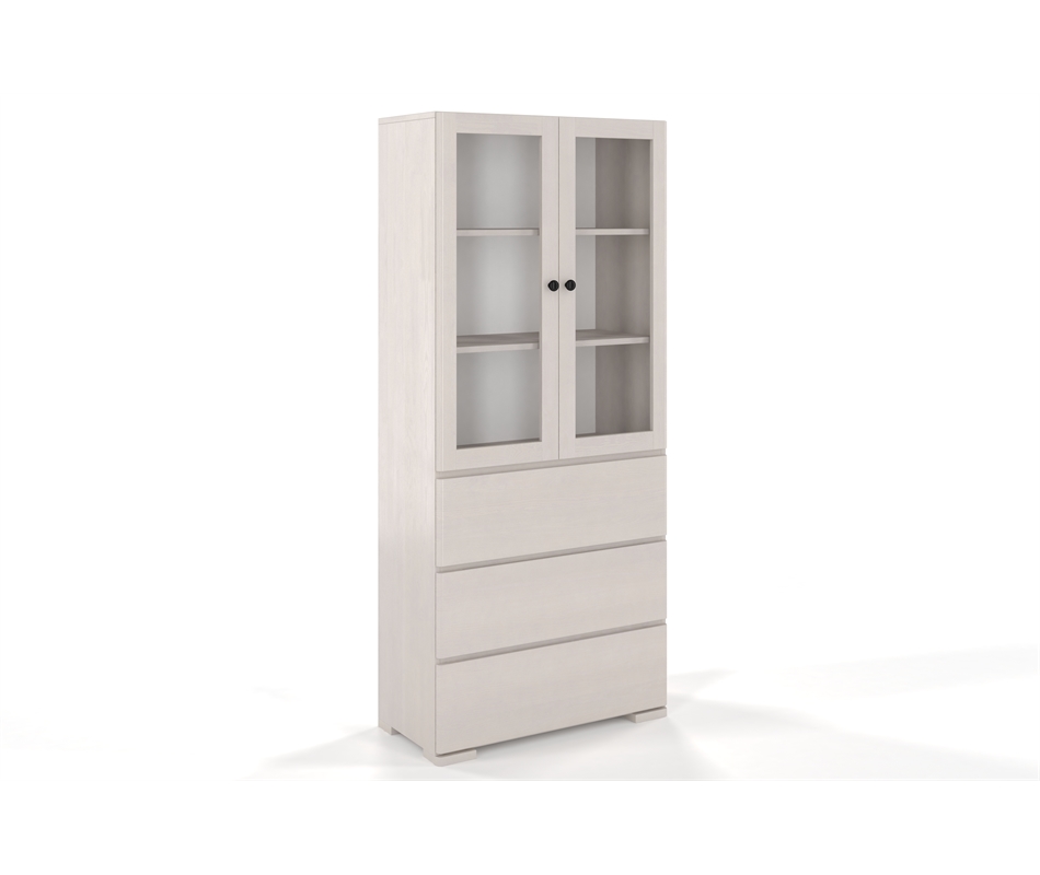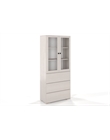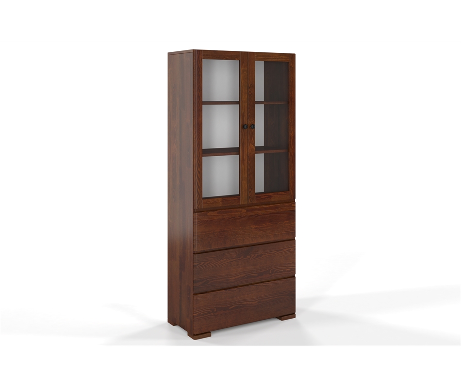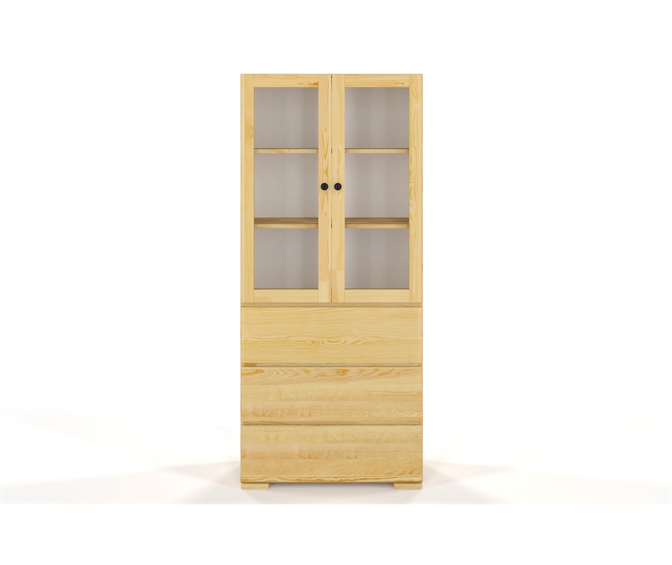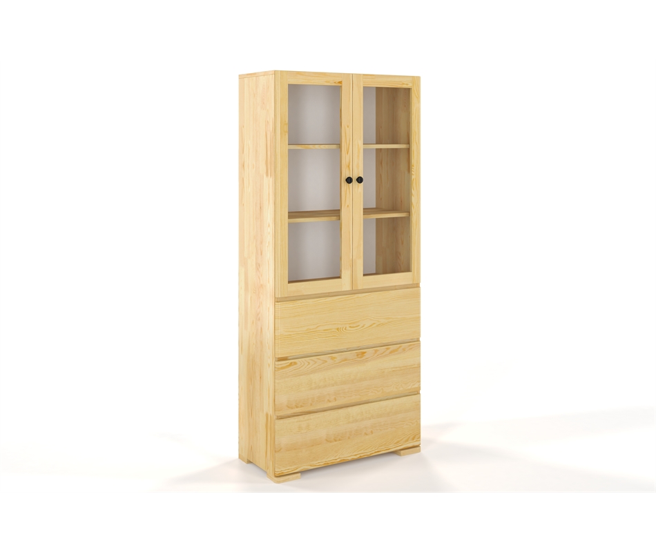 Vetrina in lamellare di pino massiccio . Altezza 182 cm, larghezza 80 cm, profondità 38 cm. Due ante di vetro più tre cassetti. La tecnica del lamellare permette di eliminare nodi ed impurità, creando un prodotto dall'aspetto quanto più possibile omogeneo e uniforme. Il legno lamellare con giuntura a pettine inoltre offre una maggiore resistenza ai danni e tende a non deformarsi per le variazioni di umidità nell'ambiente. I cassetti sono larghi 79 cm, con un'altezza di 24,7 cm. Lo spessore dell...